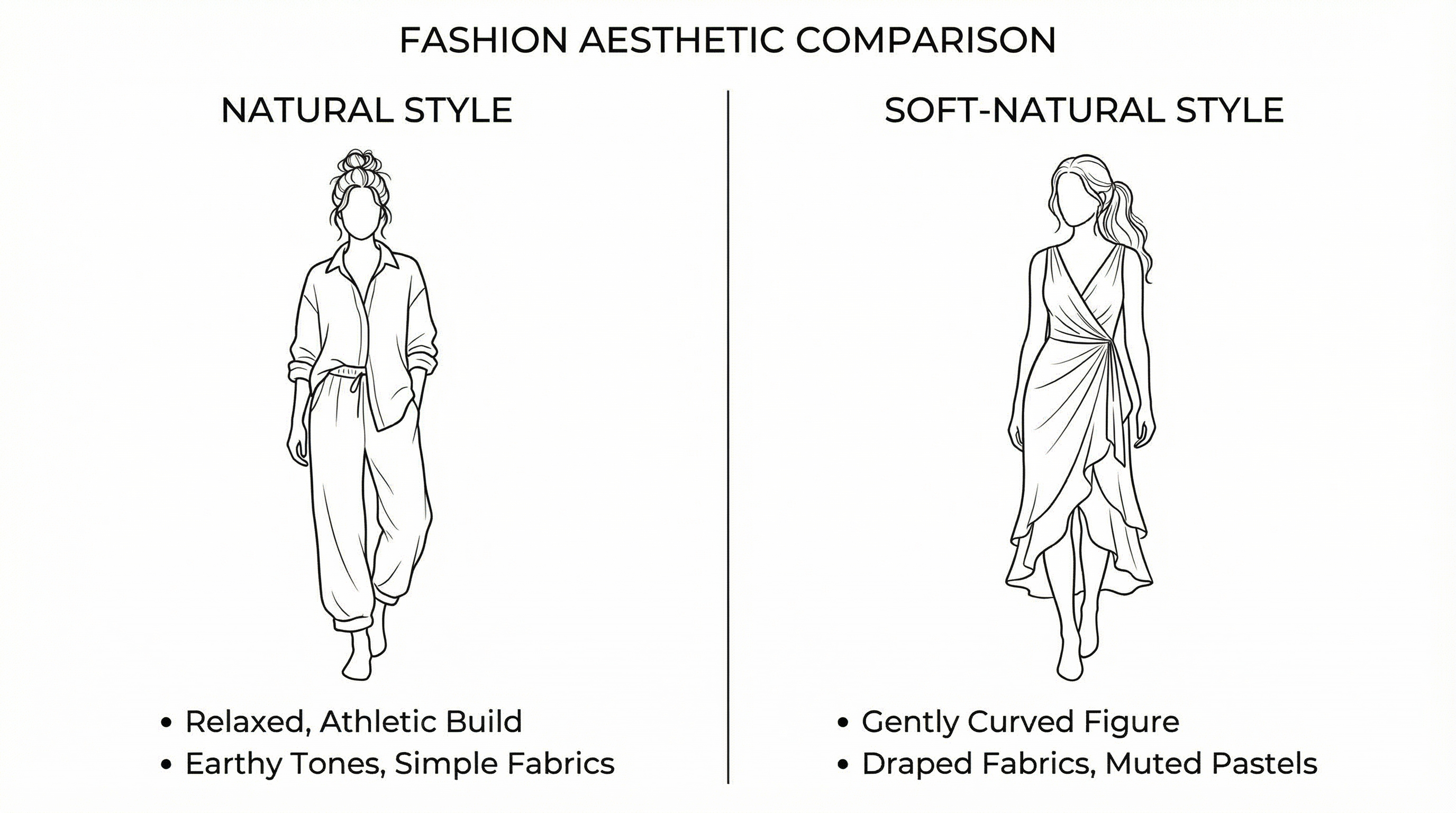 The key difference is the presence or absence of yin flesh. Pure Naturals have moderate flesh that's evenly distributed without creating pronounced curves. Their silhouette tends toward straight or slightly rectangular, with an athletic quality. Soft Naturals have soft, curvy flesh that creates a gentle hourglass or rounded quality. Their silhouette has noticeable curves even though the underlying frame is the same as a Pure Natural. In Kibbe's original system, this means Pure Naturals are balanced yang with bluntness, while Soft Naturals are yang with a yin undercurrent.